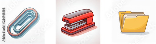 A set of office stationery items including a paperclip, a stapler, and a folder, essential for organizing and managing documents.