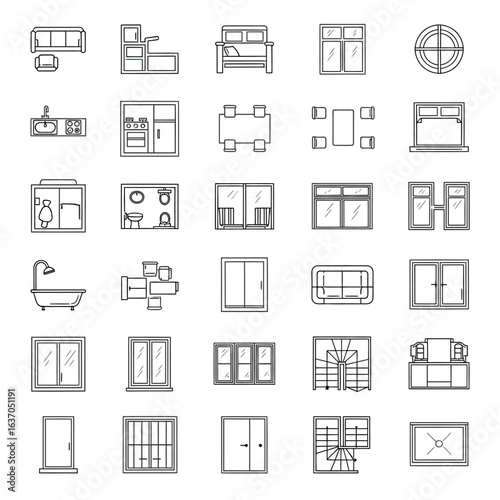 A set of outline icons on a white background depicts various architectural elements such as windows, doors, furniture, stairs, and bathroom fixtures for design.