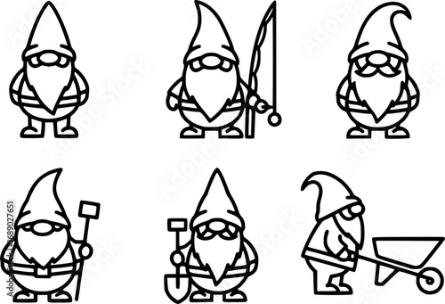 A set of outline vector icons for a garden gnome.