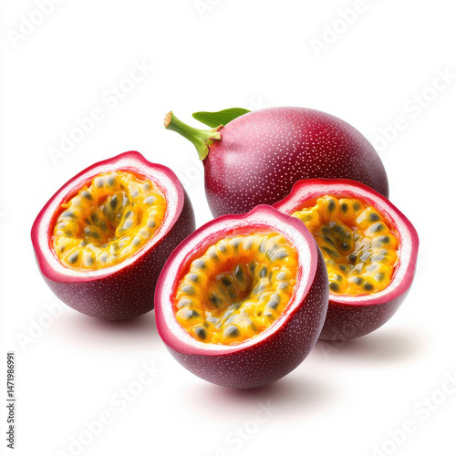 A set of passion fruit halves with spilling pulp, showcasing the bright color and texture, isolated on a white background