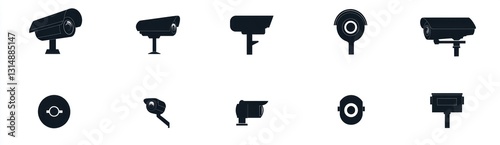 A set of simple black icons on a white background silhouettes of CCTV cameras in a flat design style