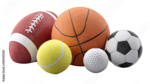 A set of various sports balls including football, basketball, and tennis ball neatly arranged, background isolated on a Transparent background, PNG file.
