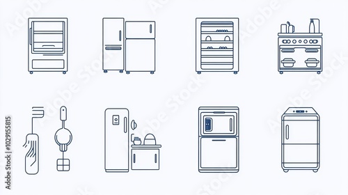 A set of vector line icons depicting fridge and freezer functionalities, including freezing and refrigeration. This outline icon collection covers symbols like refrigerator, defrosting