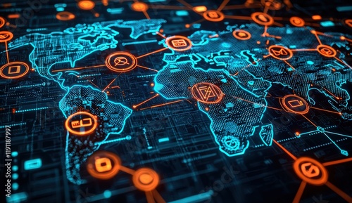 A sharp blue and orange digital map with glowing tech icons and radiating network lines