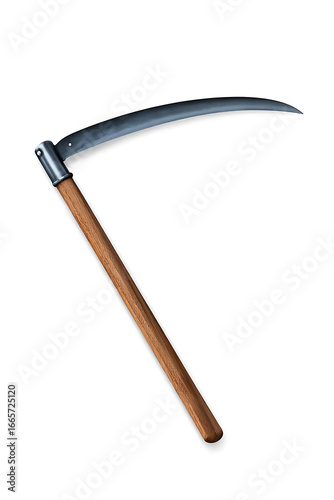 A sharp curved agricultural tool with a long wooden handle used for mowing or reaping grass and crops by hand a versatile implement for farming and gardening tasks for harvesting purposes