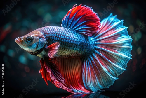 A shimmering Betta halfmoon, dramatically lit; macro photography reveals intricate aquatic detail.
