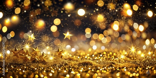 A shimmering field of golden glitter, illuminated by a soft glow of twinkling lights, with scattered golden stars, creating a magical and festive atmosphere.