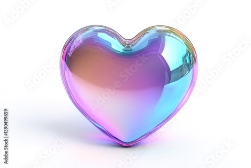 A shimmering iridescent heart shaped object on a white surface with a subtle shadow beneath it