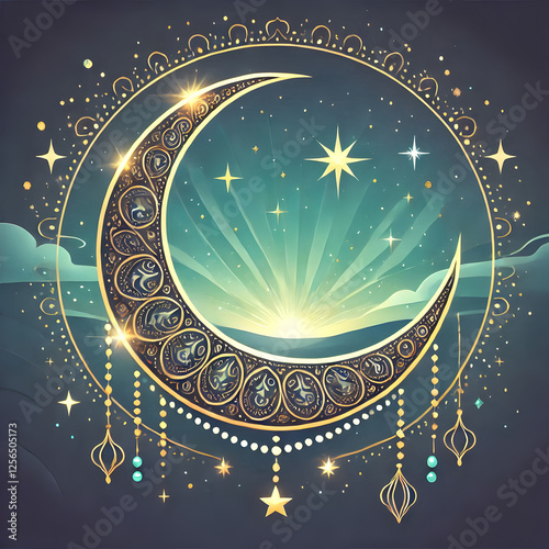 A shining golden crescent moon resting on an elegant, starry background with decorative patterns and lanterns signifying the peaceful and festive atmosphere of Ramadan and Eid celebrations.