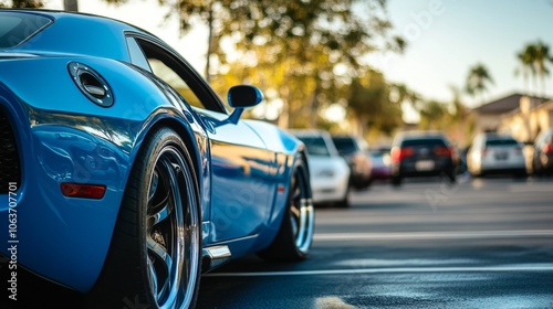 A shiny blue car parked in a parking lot, showcasing its sleek paint job.