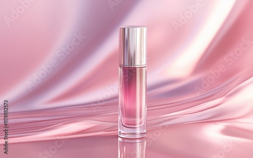 A shiny lip gloss tube with a sleek, clear design, placed on a smooth, glossy surface with a soft pastel-colored background, highlighting its elegant packaging and smooth texture