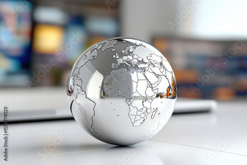 A shiny metallic globe representing global connectivity and the digital world in a modern setting.