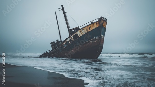 A shipwreck on a foggy beach, illustrating decay and the power of nature.