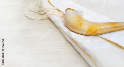 A shofar is placed on a tallit on a white wooden surface. A symbol of the Rosh Hashanah holiday. Suitable for shana tova greeting card and Yom Kippur. with free space for text