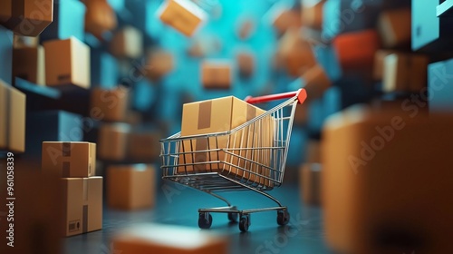 A shopping cart surrounded by floating boxes, symbolizing online shopping and e-commerce. Perfect for retail and logistic themes.