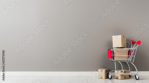 A shopping cart with boxes on it stands next to a stack of cardboard boxes against a gray background, conceptually depicting an online store selling goods