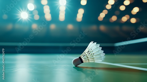 A shuttlecock resting on a sports court, illuminated by bright lights.
