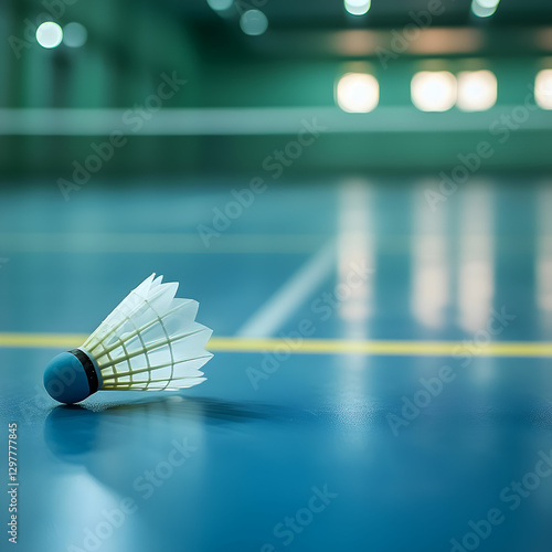 A shuttlecock resting on the smooth surface of a badminton court, with the court lines clearly visible in the background