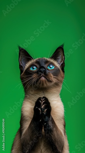 A Siamese cat kneeling with paws clasped, begging. The cat faces front, full body, eye level, on a green screen background.