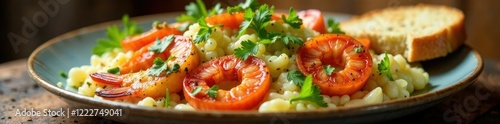 A side of crusty bread completes the meal's rustic charm, seafood, homemade feel