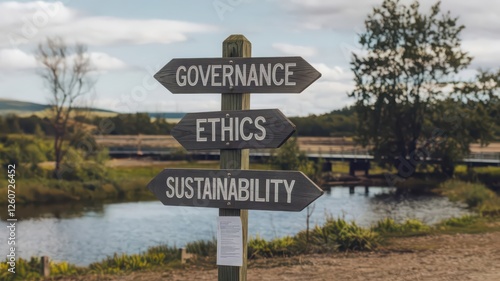A signpost displaying governance, ethics, and sustainability in a natural setting.