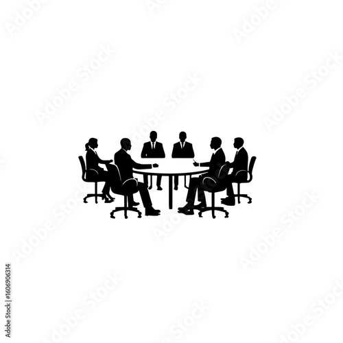 A silhouette illustration of a business meeting with people around a round table