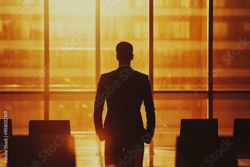 A silhouette of a businessman standing in an office building, bathed in warm sunset light, symbolizing determination and ambition.