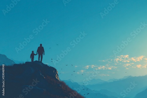 A silhouette of a father and son holding hands on top of a mountain, with a blue sky background and birds flying in the distance. The scene is bathed in the soft, warm light of morning, creating