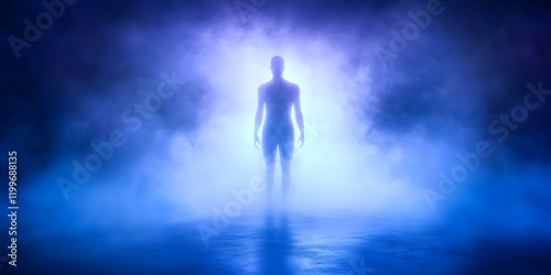A silhouette of a figure stands in a misty, illuminated area, creating a mysterious and ethereal atmosphere. Concept Silhouette Photography, Mysterious Atmosphere, Ethereal Lighting