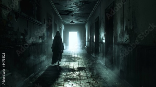 A silhouette of a ghost appearing at the end of a dark, deserted hallway