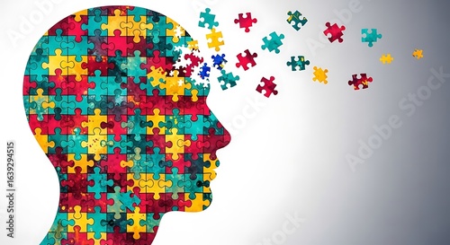 A silhouette of a head in profile formed by puzzle pieces with some pieces scattering from the top