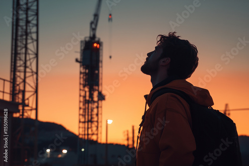 A silhouette of a human looking up at a towering AI structure, representing the towering influence of AI surpassing human control and understanding.