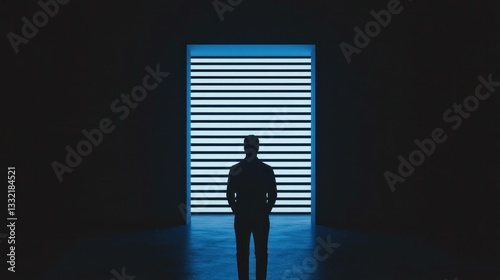 A silhouette of a man standing in front of a bright blue striped door, evoking a sense of mystery and introspection in a dark environment