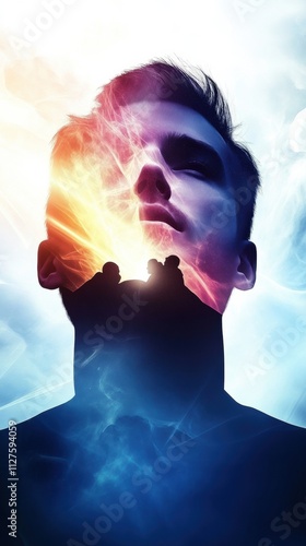 A silhouette of a man with vibrant, swirling colors symbolizing inner thoughts, AI