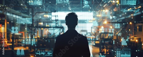 A silhouette of a manager overlooking a production area, with digital process diagrams floating around him