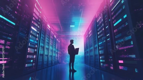 A silhouette of a person holding a laptop in a vibrant data center filled with illuminated server racks