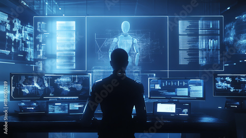 A silhouette of a person interacting with advanced technology and holographic displays in a futuristic environment.