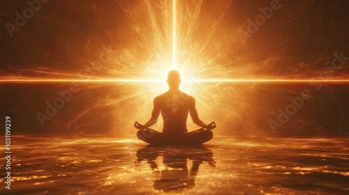 A silhouette of a person meditating in a bright light, with a reflection on the water.