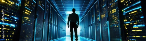 A silhouette of a person standing in a modern data center, illuminated by vibrant server lights, showcasing technology and innovation.