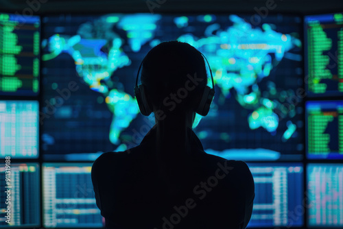 A silhouette of a person wearing headphones, monitoring multiple screens displaying world maps and data in a dark control room. Technology and surveillance concept.