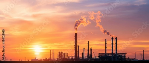 A silhouette of a sprawling industrial complex at dusk, with smokestacks and cranes prominently outlined against the sky