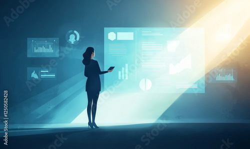 A silhouette of a woman interacts with digital data displayed in a futuristic environment, illuminated by a beam of light.