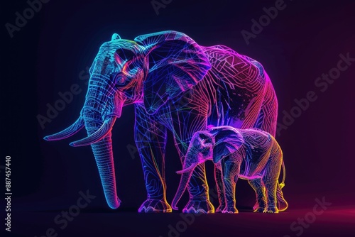 A silhouette of an elephant and its young one in a creative, neon-lit design