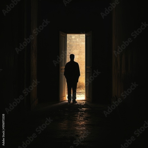 A silhouette photograph of a person standing in a doorway, the bright light outside symbolizing a welcoming community. The composition portrays the individual's journey towards finding a place