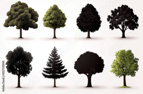 A silhouette tree line drawing in white strokes. Graphical trees elements outline symbol for architecture and landscape design drawing. Tropical, street trees.
