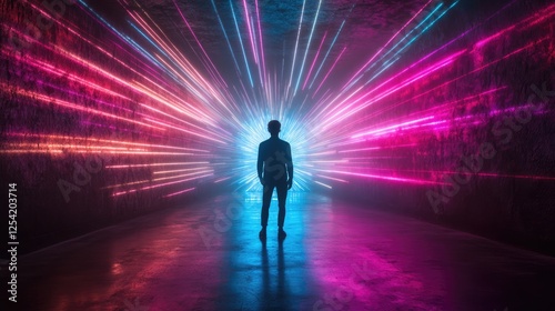 A silhouetted figure stands in a vibrant, illuminated tunnel filled with colorful light rays.