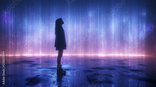 A silhouetted figure stands in awe beneath a cascading light display in a futuristic setting