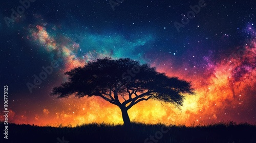 A silhouetted tree against a vibrant cosmic background of colors and stars.