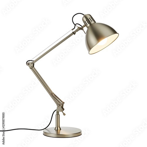 A silver adjustable desk lamp with a dome shaped lampshade on a white background in a studio setting