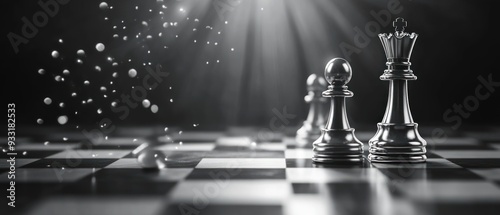 A Silver Chess Queen and Pawn on a Checkerboard with a Spotlight